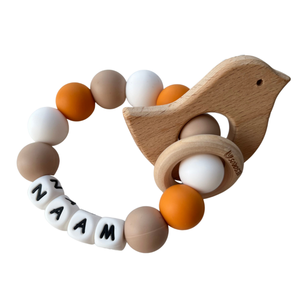 Iedere bijtring bevat een kleine houten ring. Gelieve nog een extra houten figuurtje uit de lijst te kiezen. De combinatie van deze 2 figuren zorgt ervoor dat de bijtring ook als rammelaar gebruikt kan worden. Extra speelplezier gegarandeerd!