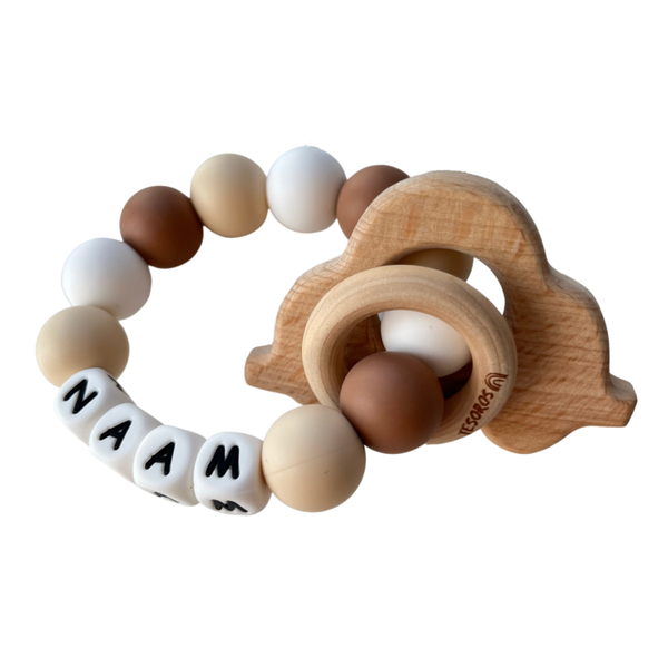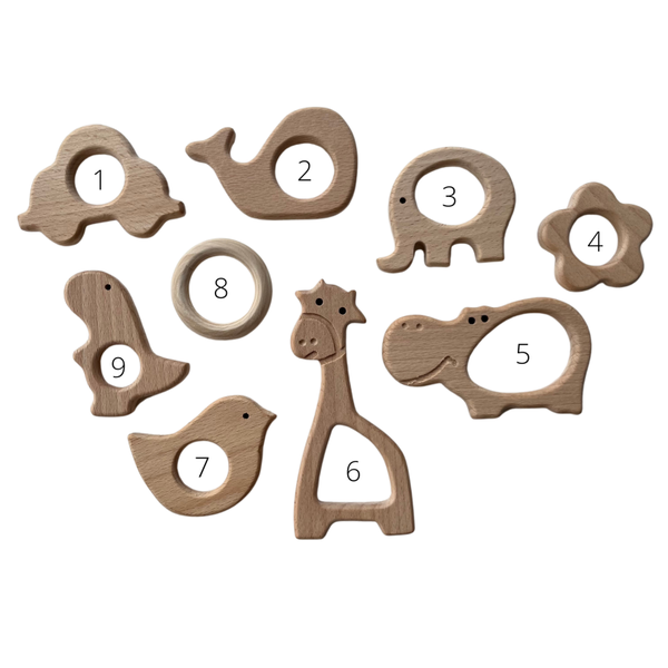 Iedere bijtring bevat een kleine houten ring. Gelieve nog een extra houten figuurtje uit de lijst te kiezen. De combinatie van deze 2 figuren zorgt ervoor dat de bijtring ook als rammelaar gebruikt kan worden. Extra speelplezier gegarandeerd!