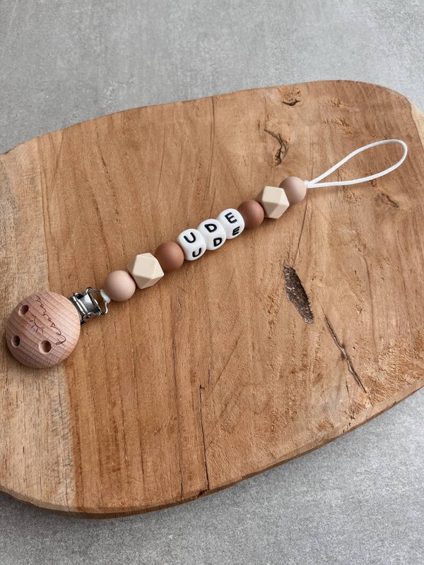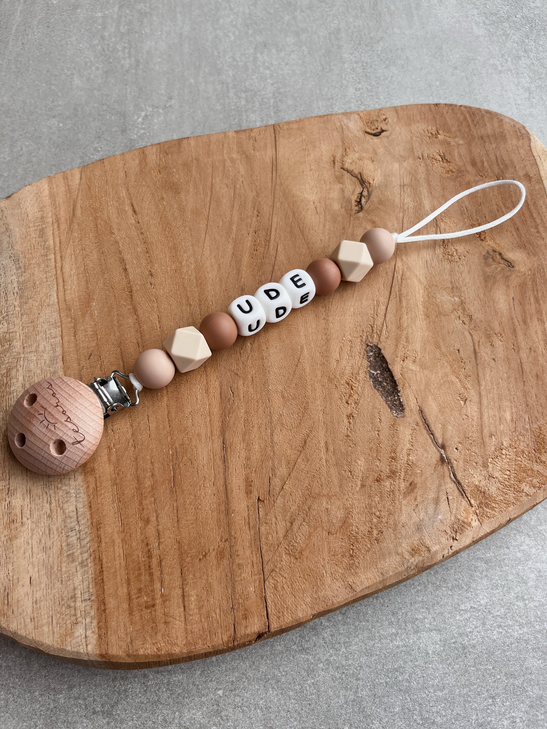 Dit tutkoordje bevat de kleuren bruin, havermout en beige. Het tutkoord kan helemaal naar wenst samengesteld worden, met of zonder naam. Gelieve hiervoor de keuzeopties te gebruiken.