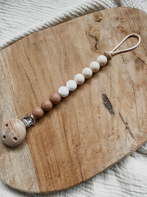 Dit tutkoordje bevat de kleuren bruin, beige en wit. Het tutkoord kan helemaal naar wenst samengesteld worden, met of zonder naam. Gelieve hiervoor de keuzeopties te gebruiken.