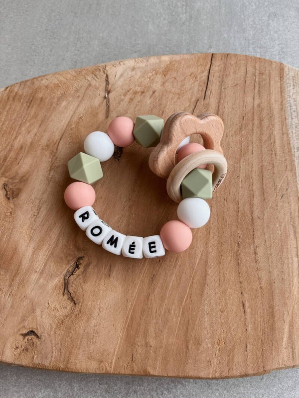 Graag een bijtring met naam? Dat kan maar... safety first! Omwille van de stevigheid kiezen we ervoor om maximum 5 letterkralen te gebruiken. Voor langere namen kan een bijtring met 1 letter een leuk alternatief zijn. De volgende speciale letterkralen zijn beschikbaar: