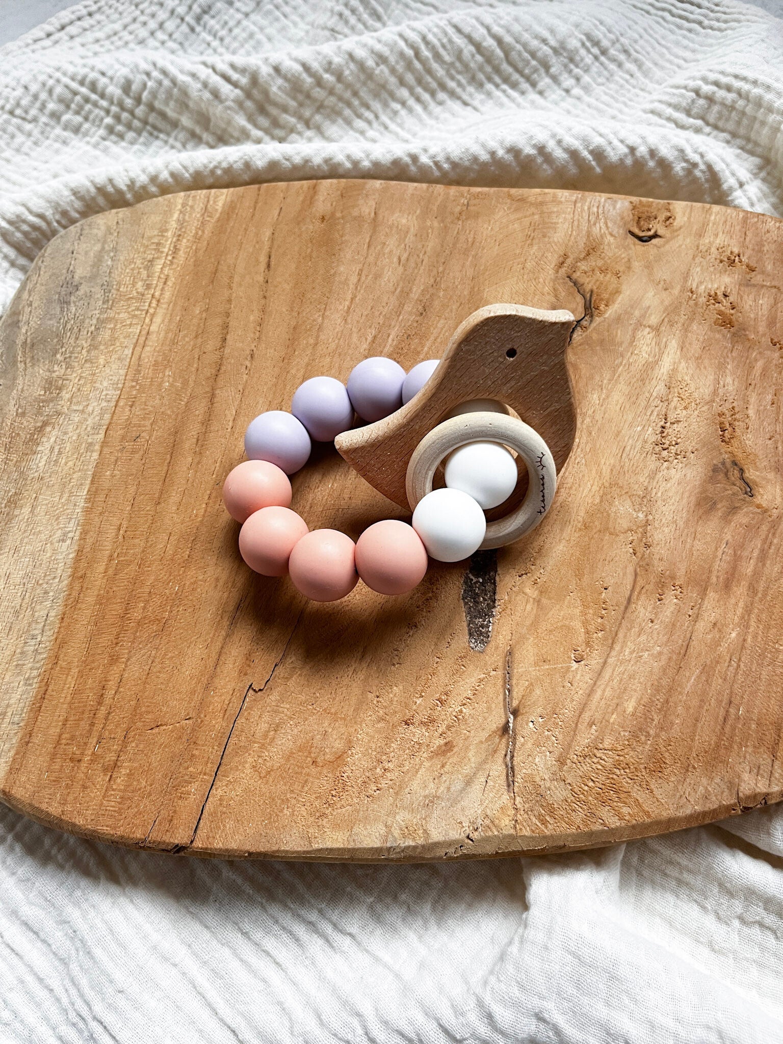 Deze bijtring bevat de kleuren oudroze, lila en wit.