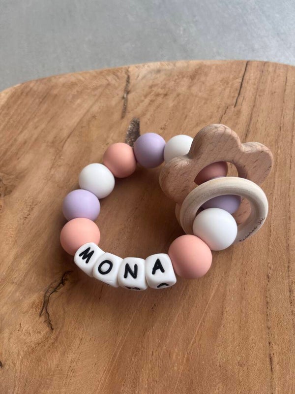 Iedere bijtring bevat een kleine houten ring. Gelieve nog een extra houten figuurtje uit de lijst te kiezen. De combinatie van deze 2 figuren zorgt ervoor dat de bijtring ook als rammelaar gebruikt kan worden. Extra speelplezier gegarandeerd!