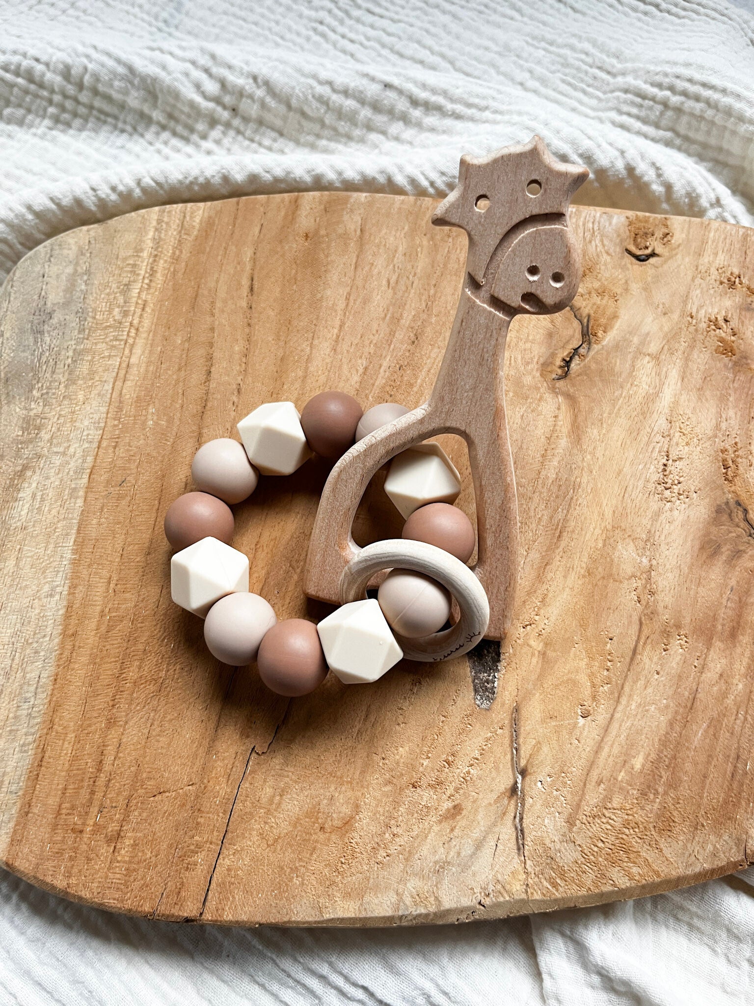 Iedere bijtring bevat een kleine houten ring. Gelieve nog een extra houten figuurtje uit de lijst te kiezen. De combinatie van deze 2 figuren zorgt ervoor dat de bijtring ook als rammelaar gebruikt kan worden. Extra speelplezier gegarandeerd!