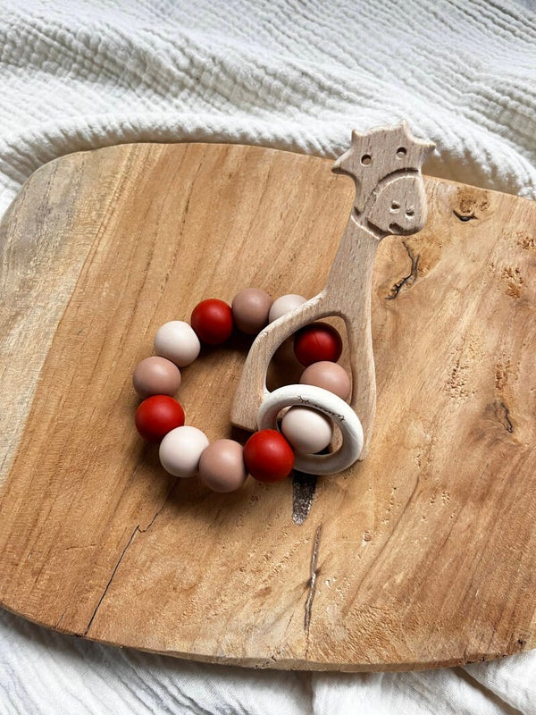 Iedere bijtring bevat een kleine houten ring. Gelieve nog een extra houten figuurtje uit de lijst te kiezen. De combinatie van deze 2 figuren zorgt ervoor dat de bijtring ook als rammelaar gebruikt kan worden. Extra speelplezier gegarandeerd!